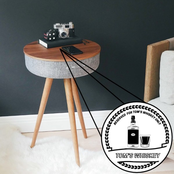 Tabblue Personalised Bluetooth Side Table With Surround Sound - Dark Wood - Whiskey Sticker